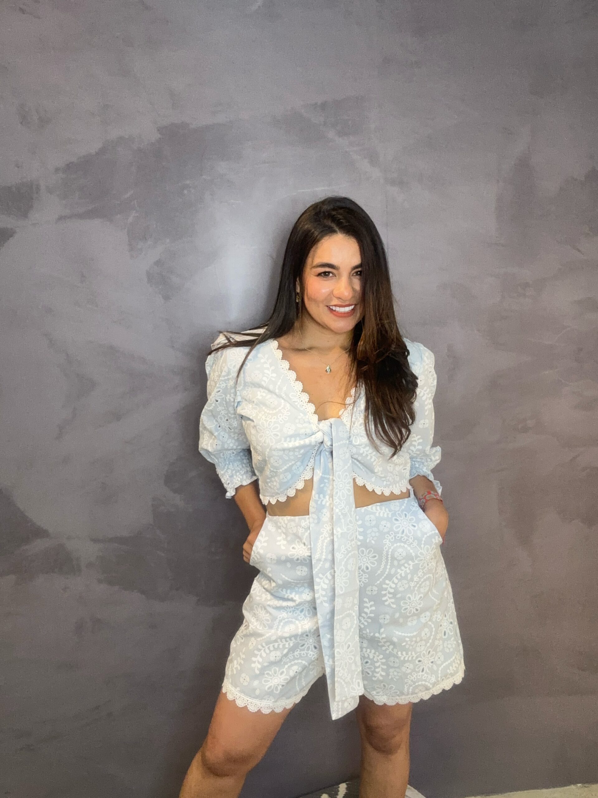 Con su confección en ojalillo, este set ofrece textura, elegancia y un toque romántico que realza tu figura y te hace destacar sin esfuerzo.